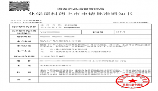 开门红!北大医药帕利哌酮原料药成功获得国家药监局注册批准
